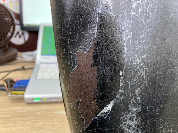 強化パテをハケ塗りし、ドライヤーで乾かせている最中から、白い気泡が無数に現れます。