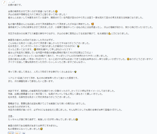 本日も「合同合宿」の参加者から続々と嬉しいメッセージが届きましたので、ご紹介させていただきます。