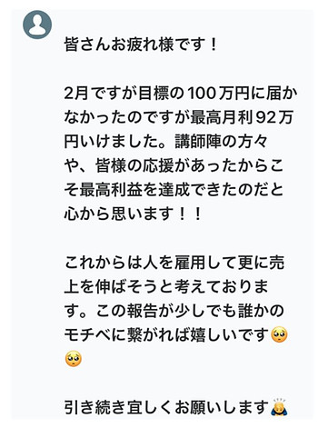 他のスクールではずっと赤字続きだったのですが、月収50万円以上を出せるようになったので驚いています。